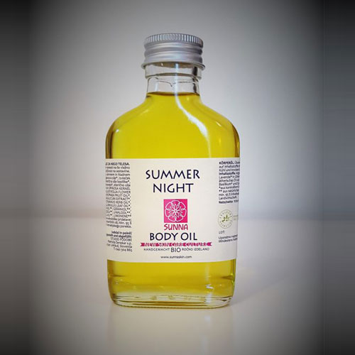 Summer Night Body Oil vsebuje skrbno izbrano mešanico bogatih negovalnih hladno stiskanih olj ter eterična olja, ki so naravni repelenti. Z njim odženete dve muhi na en mah: imate negovano, osveženo kožo in … odganjate komarje! Predstavlja bogato nego kože, ki kožo varuje pred izsušitvijo ter jo pomaga ohranjati zdravo. Kožo hrani in pomirja. Izboljšuje strukturo kože ter ji pomaga ohranjati svež in sijoč videz. Ob redni uporabi postane koža bolj prožna, voljna in mehka.
